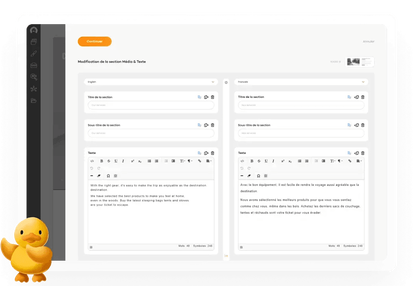 À la différence des autres outils de création de sites Web, qui nécessitent souvent de créer des pages supplémentaires pour chaque langue, RubberDuck simplifie le processus en permettant aux utilisateurs de gérer plusieurs langues au sein de la même page et ce, sans tracas.