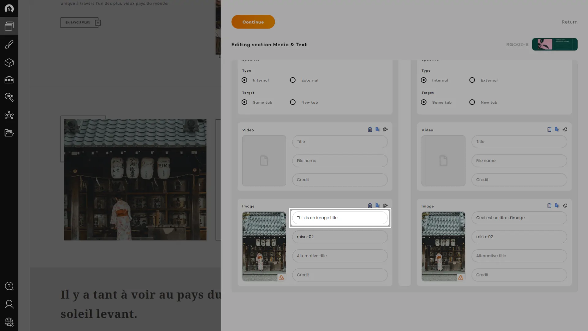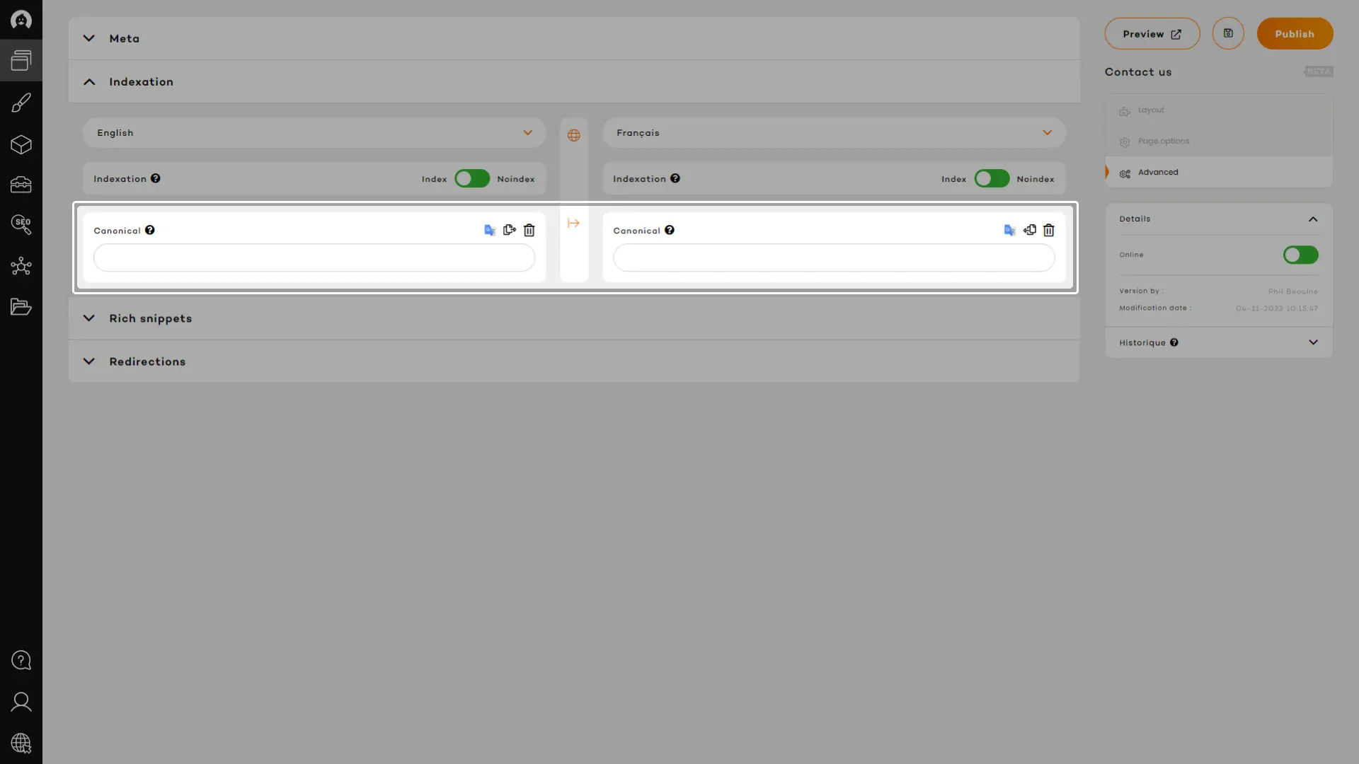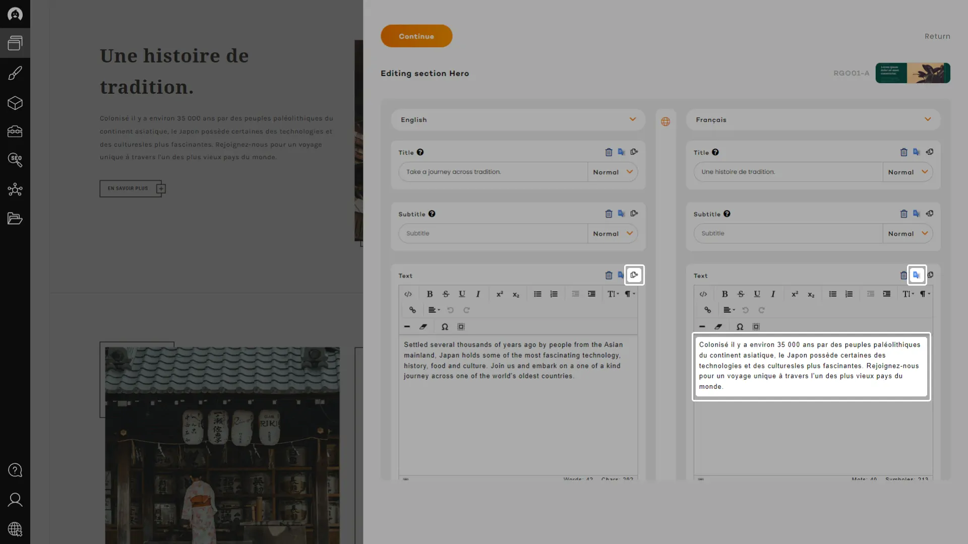 Using the quick copy function, available for every content field, you will be able to send all existing content from that field on the other side. Doing that will also copy any image and link in the other panel and apply the URL from the appropriate language if it exists. A real charm!