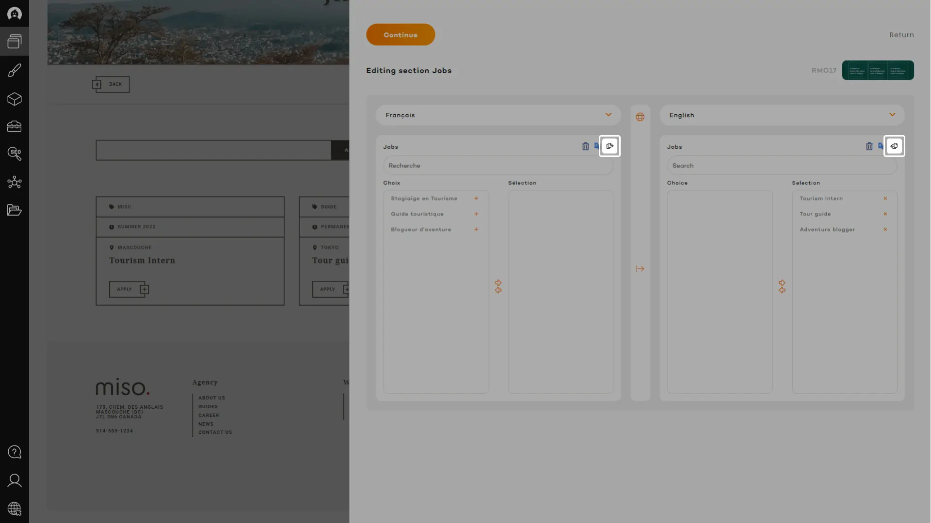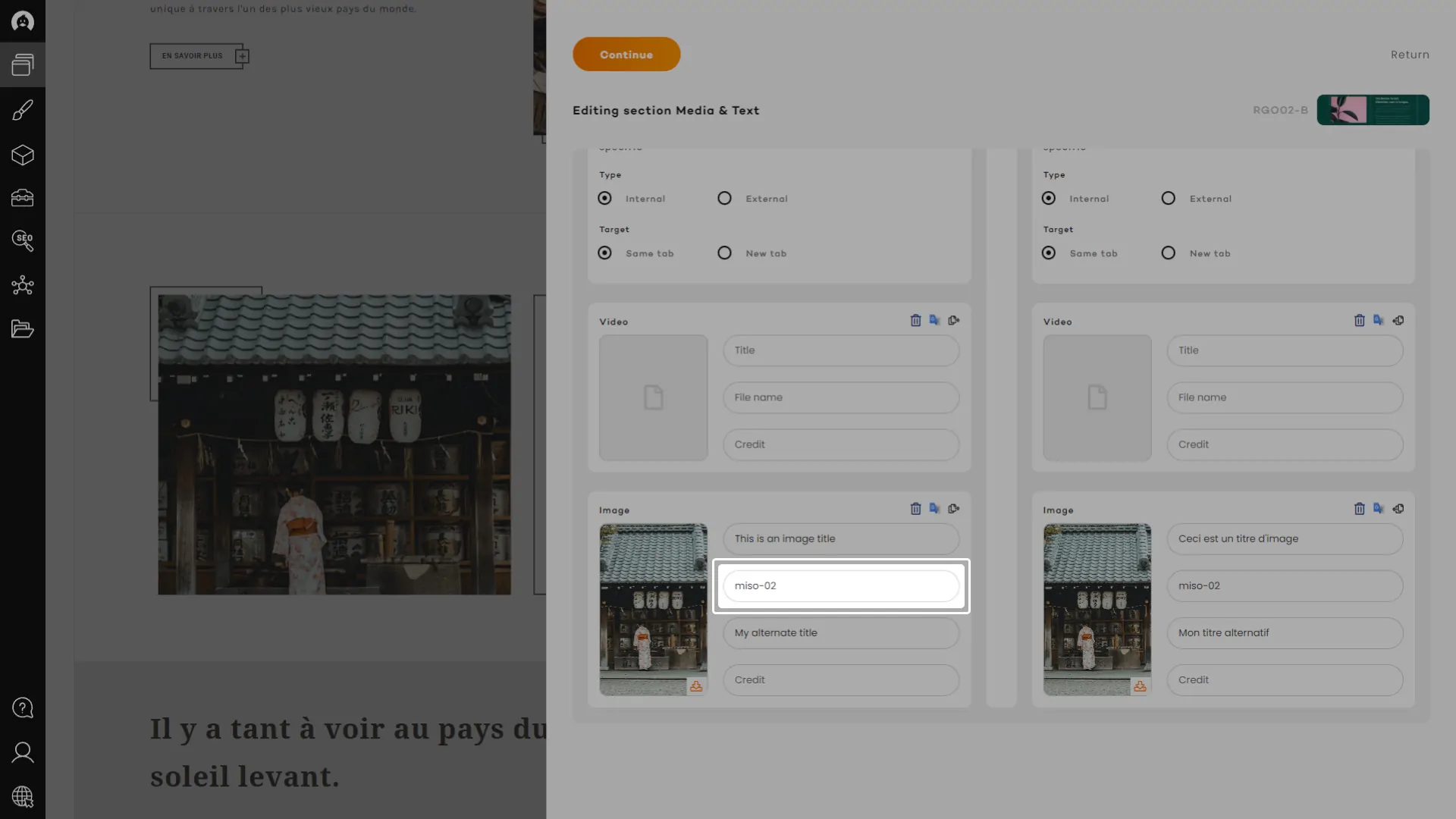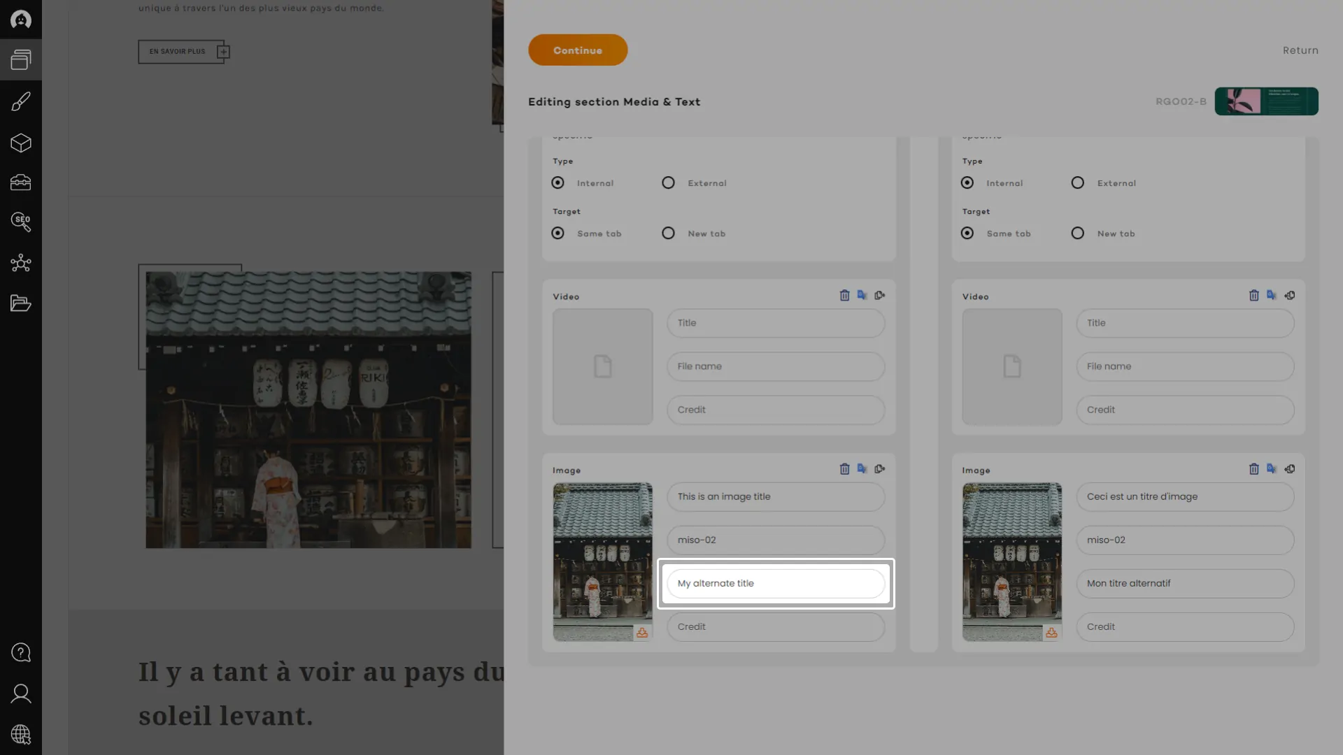Using the quick copy function, available for every content field, you will be able to send all existing content from that field on the other side. Doing that will also copy any image and link in the other panel and apply the URL from the appropriate language if it exists. A real charm!