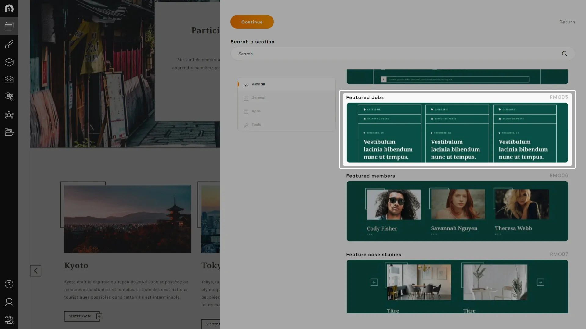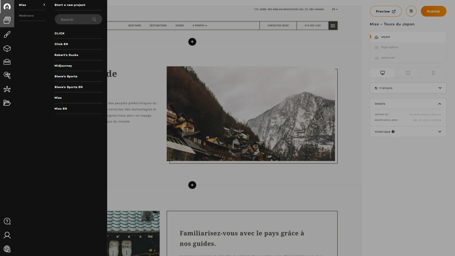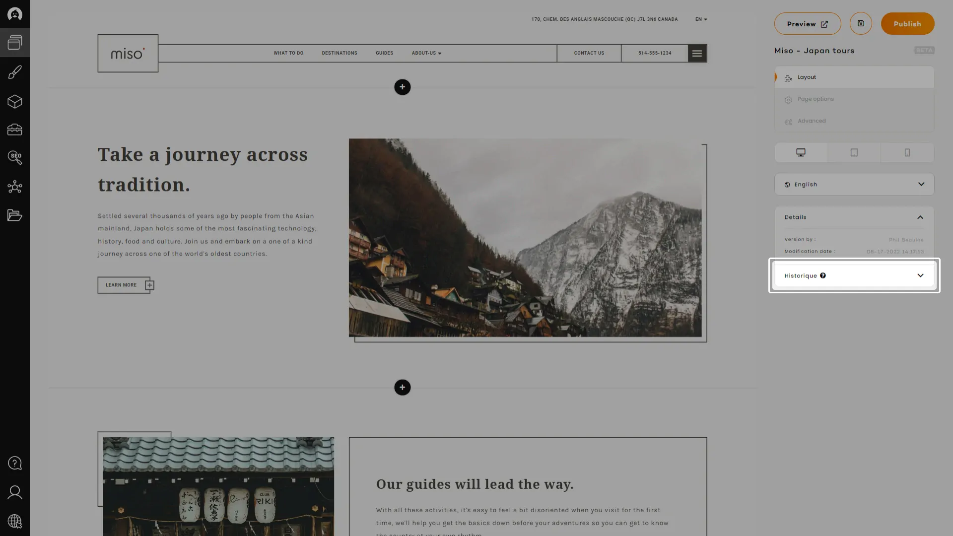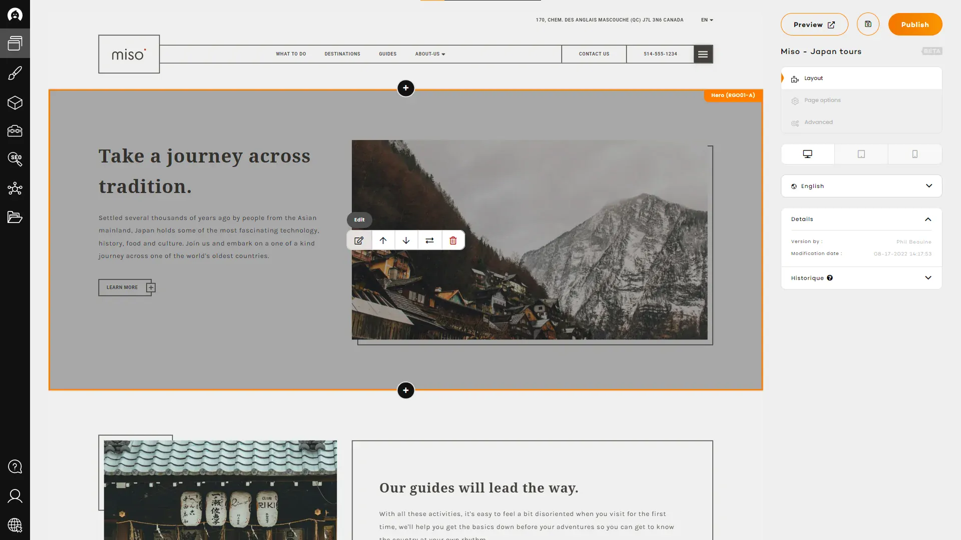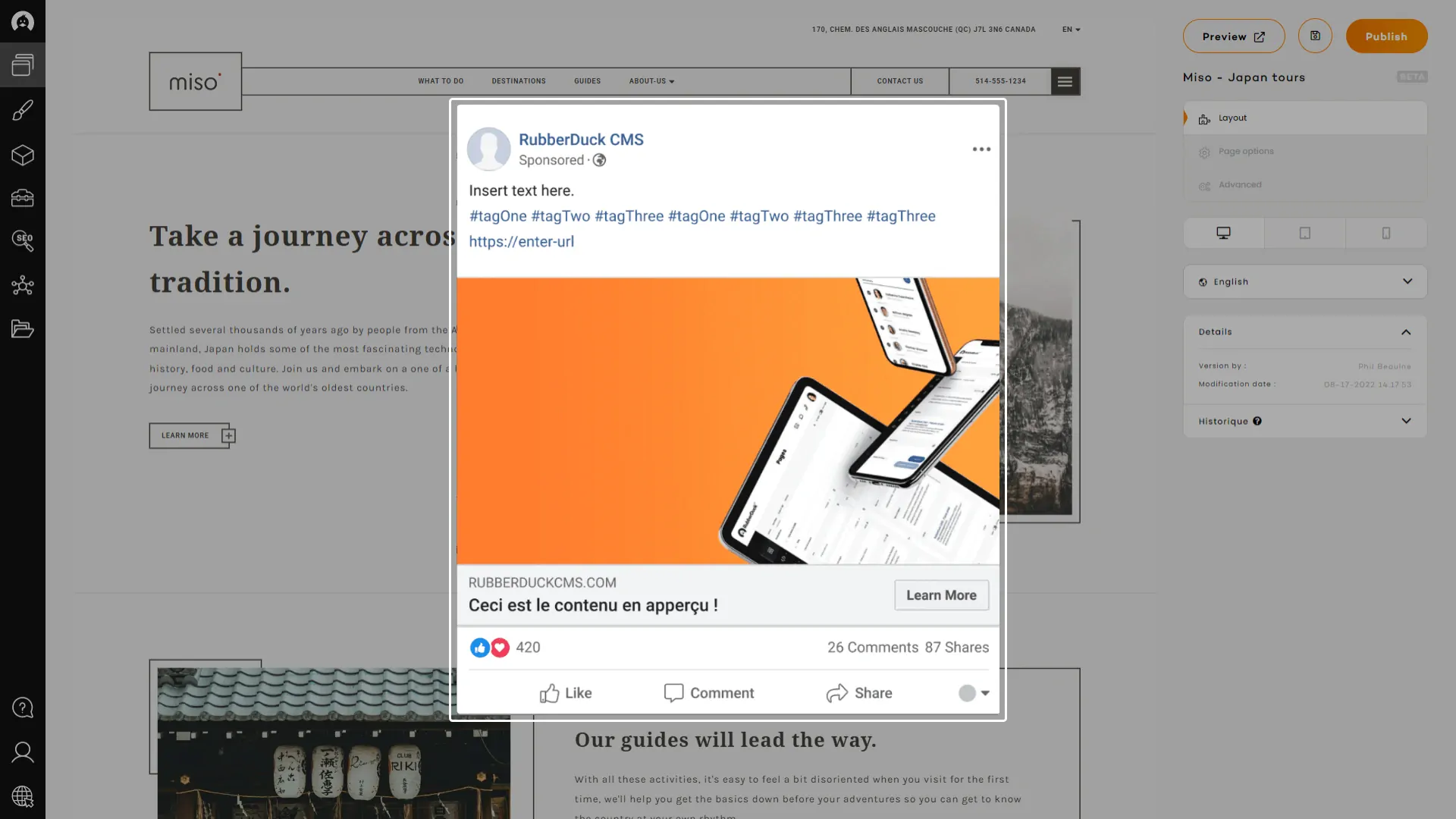 You will find the very same set of sections in every RubberDuck websites, and each of them will hold the same set of content fields than all of his counterparts. This system enables the website to keep improving and allows you to change the template of a website for a more recent, more suitable, or trendier one, in a matter of minutes.
