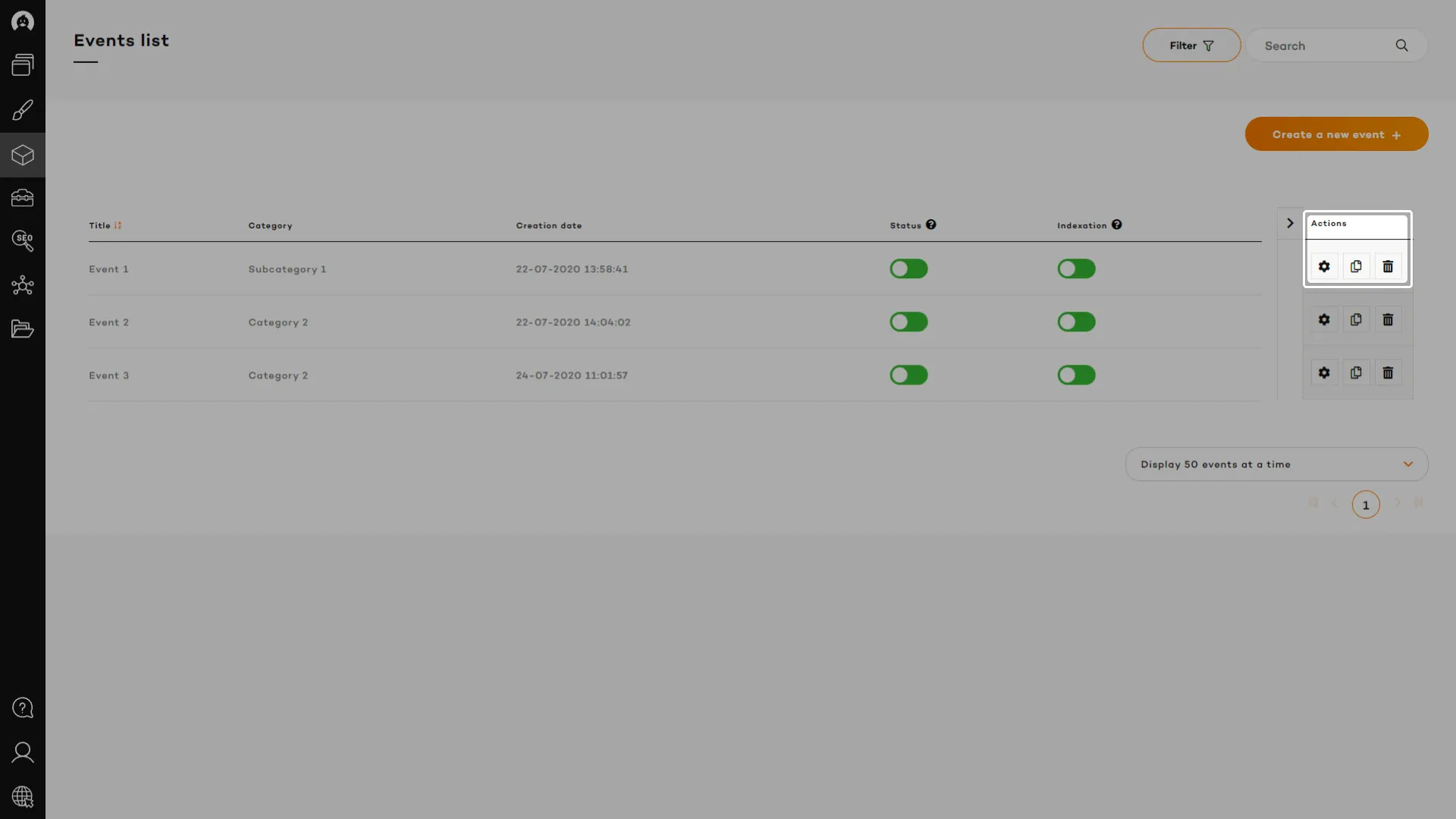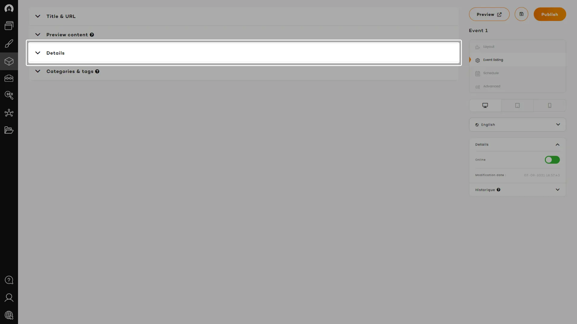 & Events detailed information tab includes: event date and time, event