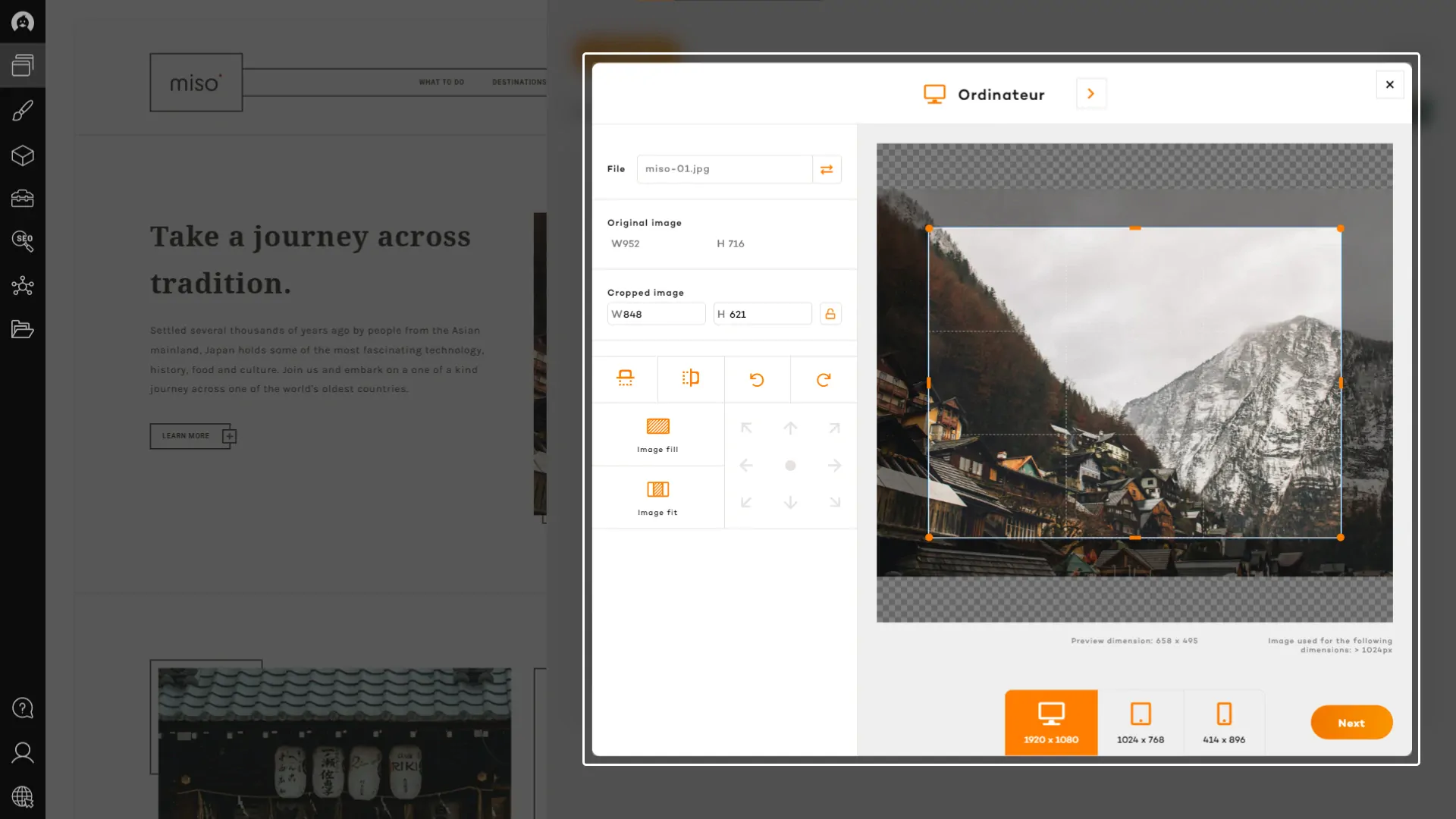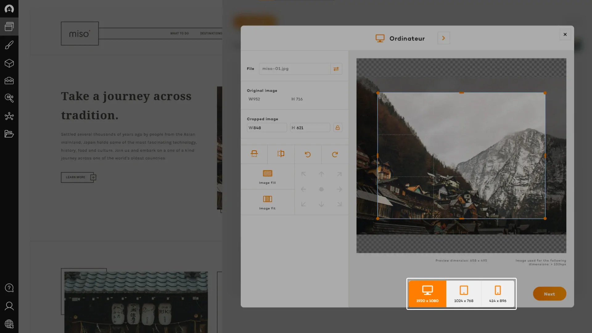 Adjust the dimensions of each image with the crop tool. Our cropping system allows you to crop an image to the ideal proportions for each location.