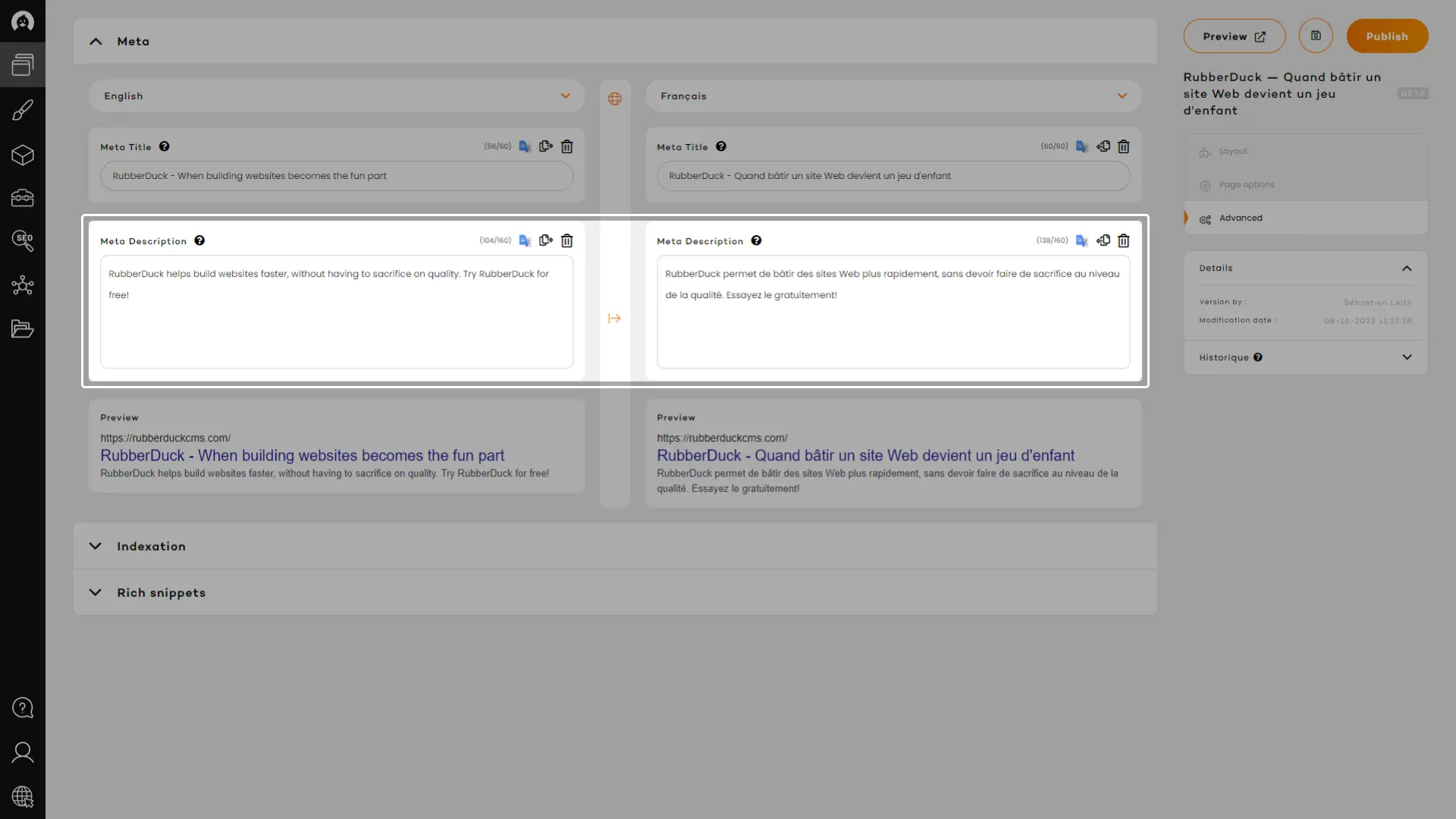 Everywhere you can manage content in RubberDuck, you will be able to do it seamlessly across our very own and unique multi-language panels.